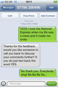 Two trains later and you’re in Sheffield, killing time before your first bus of the day. There are more direct routes from the North Yorkshire coast to the Welsh capital, just not on your budget. In the Interchange you ask a bloke at a help plinth “Where’s the National Express bus go from?” He raises his eyes from his paper just enough to nod over your shoulder at the big white National Express bus behind you. It’s already been a long day. On board, signs on every seat ask you to text feedback on your service, so you do.