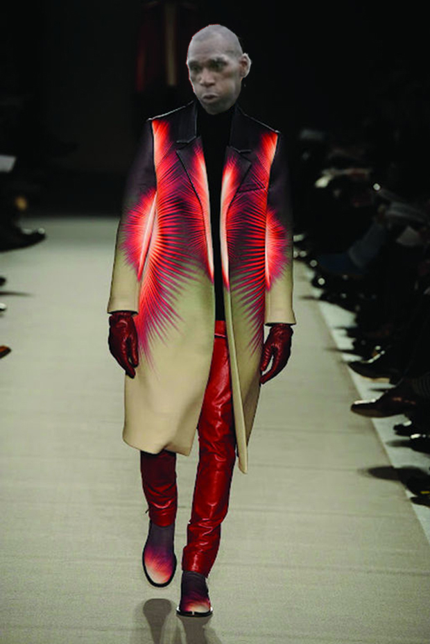 Bold and bright patterns are in as shown in this garment inspired by a Japanese children’s cartoon series about a time travelling livestock auctioneer. What appears to be PVC gloves and trousers are actually part of a full-body PVC morph-type suit minus the head. Leo also wears a look of embarrassment which is all his own work. |