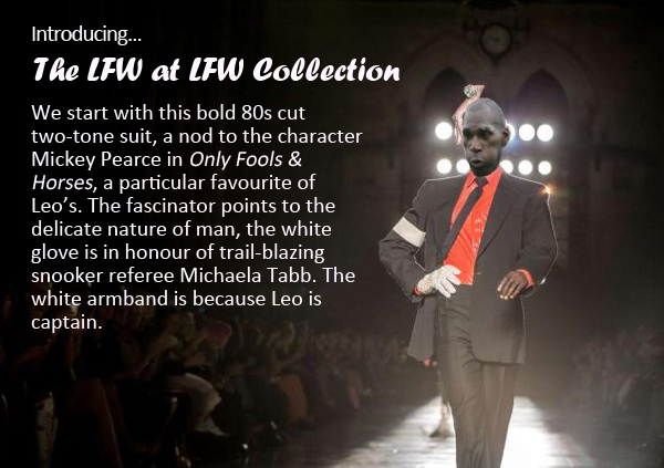 The thing is, the reason LFW trends so significantly is actually because London Fashion Week and Leo Fortune-West are not mutually exclusive of one another. They are actually fused as one, and the star turn on the cat walks of the exclusive West Central postcodes is none other than Big Leo himself; LFW is LFW, and here for your delectation are some of this year’s highlights.